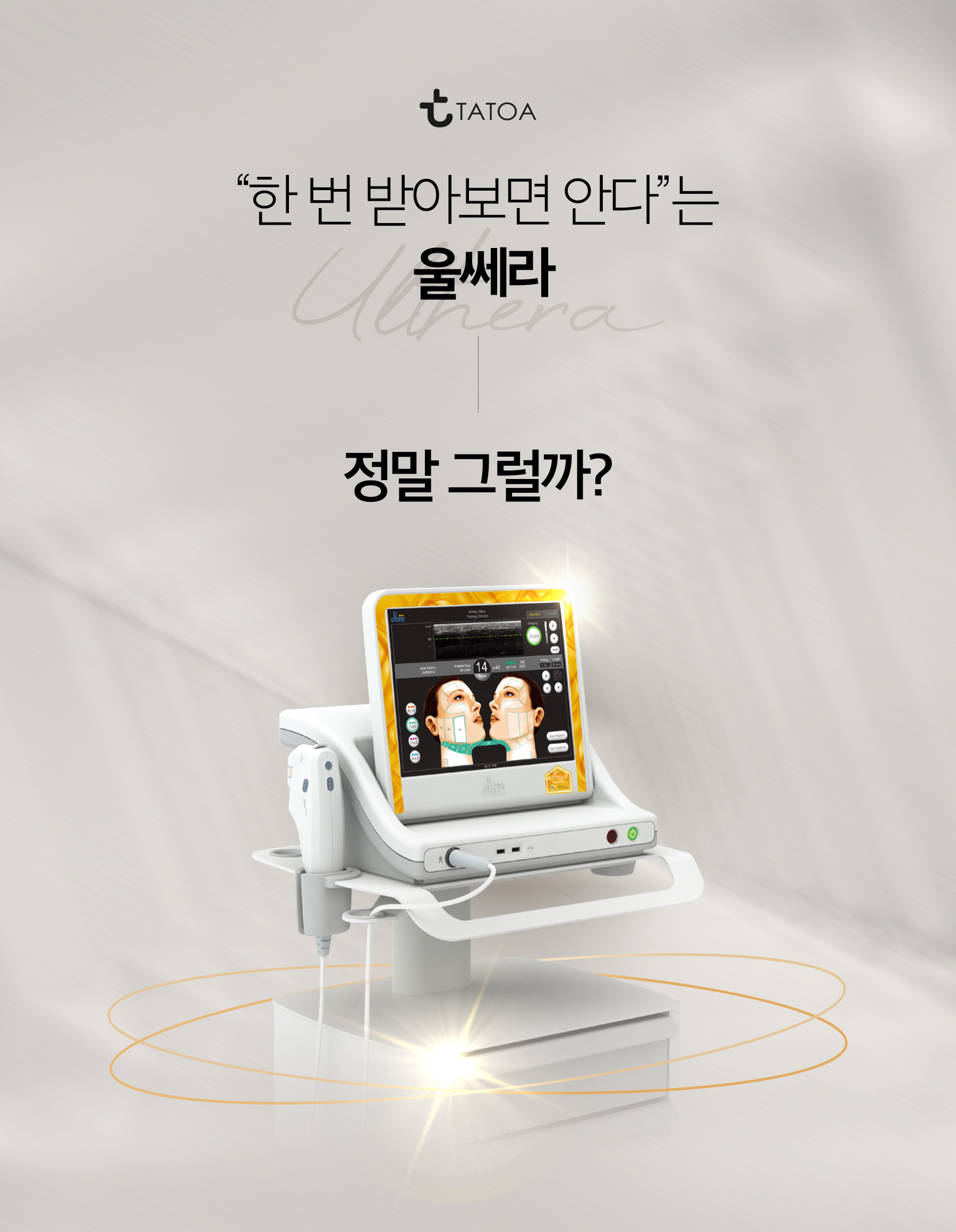 안녕하세요, 타토아의원 의정부점입니다. 울쎄라 시술에 대해 이야기하다 보면 짧은 시간 안에 얼굴 인상이 달라질 것 같고, 한 번의 시술만으로도 확실한 변화를 기대해도 될 것처럼 느끼시는 분들이 많습니다. 실제로 온라인이나 SNS에서는 한 번 받아보면 알게 된다는 표현으로 울쎄라가 자주 언급되기도 합니다. 물론 이런 기대가 전혀 근거 없는 이야기는 아니지만, 그 한 문장만으로 울쎄라라는 시술을 모두 이해하기에는 현실은 조금 더 복합적인 면이 있습니다.