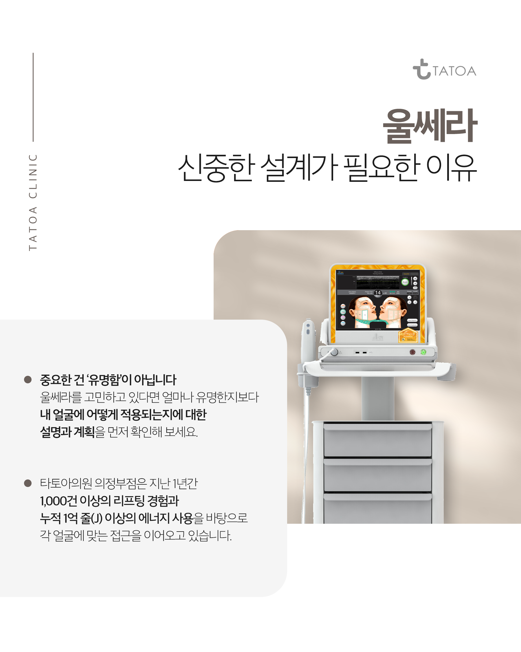 울쎄라는 정해진 공식처럼 적용하는 시술이 아니라, 얼굴마다 다르게 접근해야 하는 시술입니다. 어디를 살리고, 어디는 건드리지 않아야 하는지를 먼저 판단하는 과정이 선행되어야 합니다. 타토아의원 의정부점은 지난 1년간 다수의 리프팅 시술을 진행하며 다양한 얼굴 구조와 피부 상태를 지속적으로 마주해 왔습니다. 그래서 울쎄라를 고민하고 계신 분들께는 시술의 유명세보다, 내 얼굴에 이 시술이 어떤 방식으로 적용되는지에 대한 설명을 먼저 들어보시길 권해드립니다. 충분한 설명과 계획이 동반된다면 울쎄라는 막연한 기대에 맡기는 선택이 아니라, 스스로 납득할 수 있는 결정이 될 수 있습니다. 오늘도 긴 글 읽어주셔서 감사합니다.